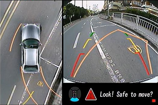 左右側(cè)倒車(chē)輔助線—通過(guò)切換不同視角,可以看到車(chē)前輪與障礙物之間的距離,為車(chē)主通過(guò)提供直接的提示。