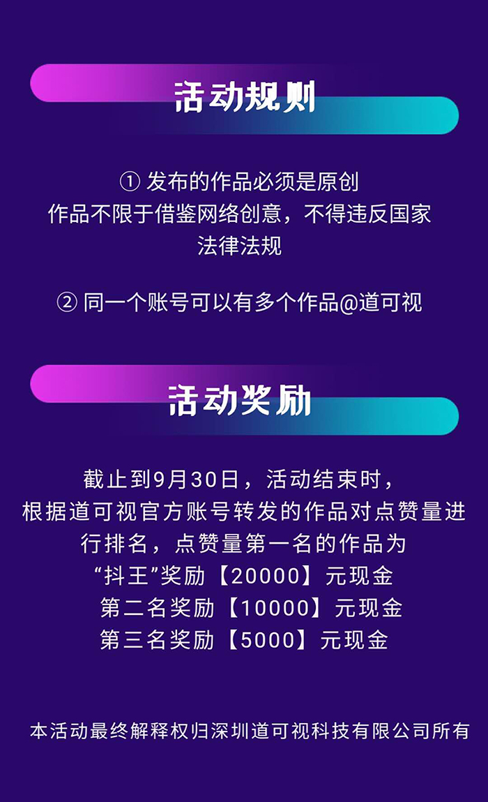 2020道可視“抖王”爭(zhēng)霸賽第一季截止到9月31日,活動(dòng)結(jié)束時(shí),根據(jù)道可視官方賬號(hào)轉(zhuǎn)發(fā)的作品對(duì)點(diǎn)贊量進(jìn)行排名,點(diǎn)贊量第一名的作品為“抖王”獎(jiǎng)勵(lì)【20000】元現(xiàn)金;第二名獎(jiǎng)勵(lì)【10000】元現(xiàn)金;第三名獎(jiǎng)勵(lì)【5000】元現(xiàn)金。