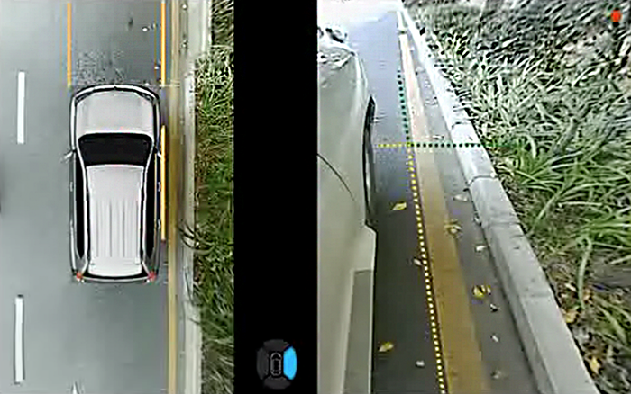 針對這一場景,道可視的“??柯费履J健痹诘管嚈n模式下開啟雙閃時,會將車身兩側(cè)(整個車身、前后輪、踏板等)同時顯示,以這種近場垂直的鳥瞰圖顯示方式,配合安全參考線(與車身距離為20CM),有效的解決了??柯费聲r可能對輪胎及輪轂造成刮傷的問題。